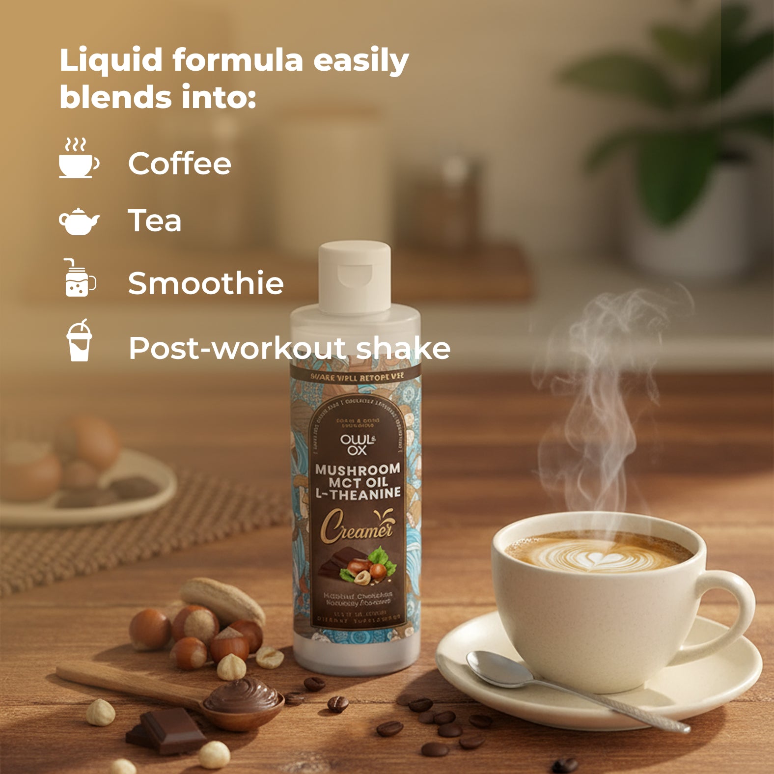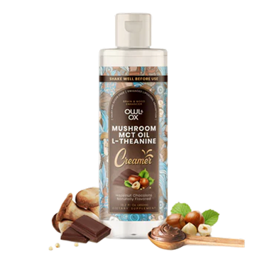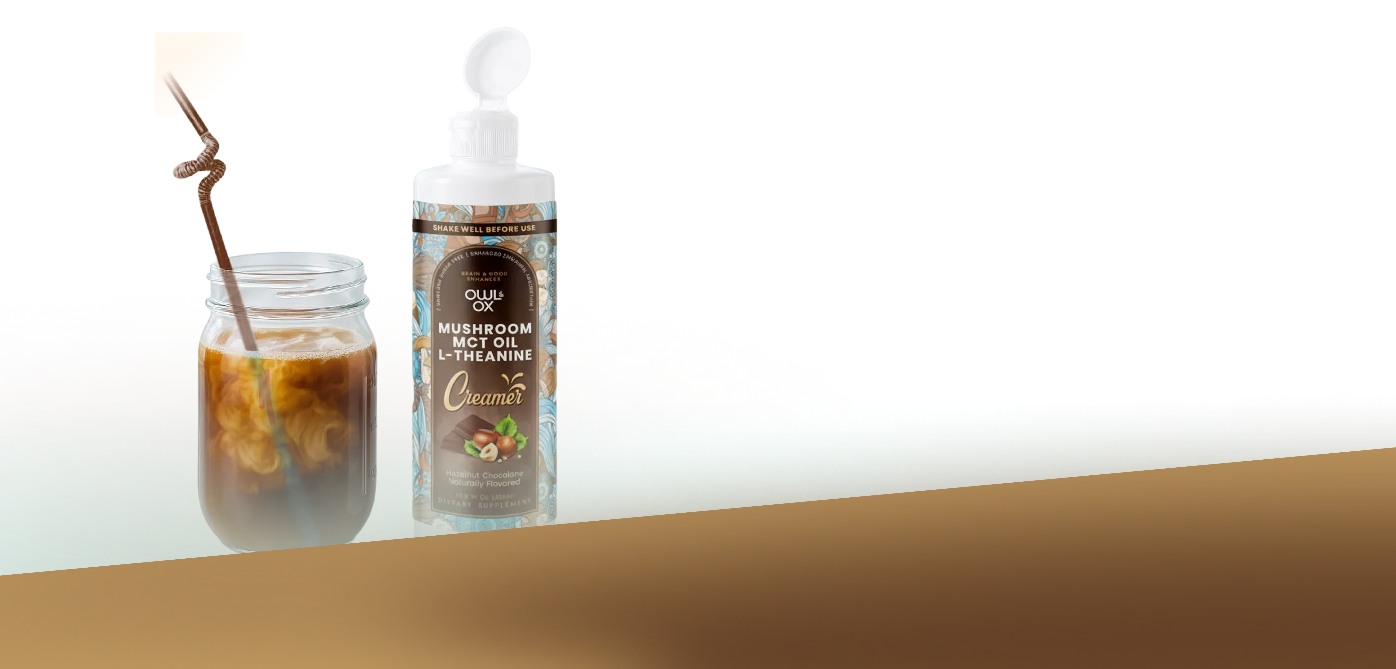 - OWL & OX Brain and Mood Creamer uses purposeful active ingredients: Mushroom Blend, MCT Oil and L-Theanine.
