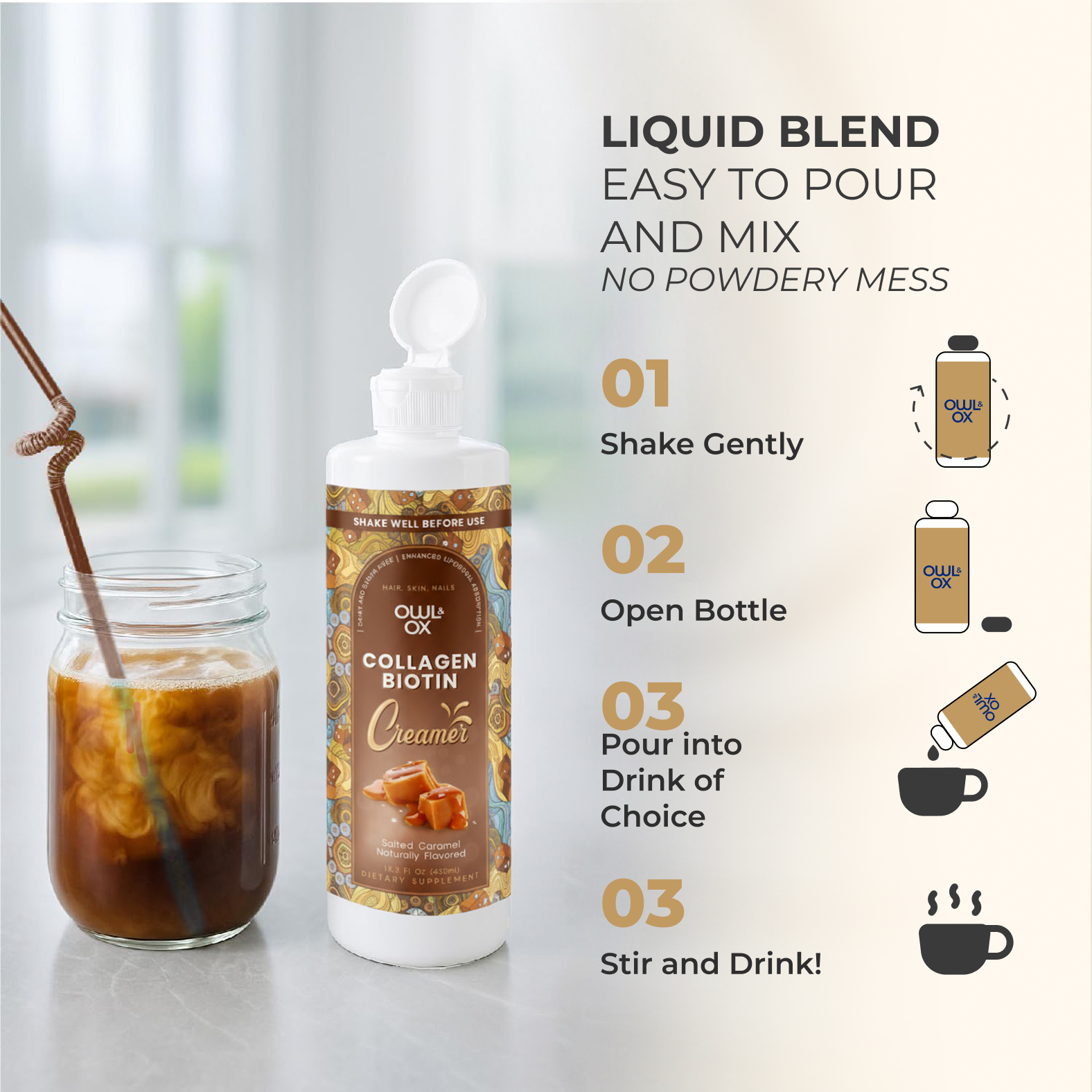 - BIOTIN-INFUSED: Start your day with a nourishing and convenient boost. Our specially crafted creamer with the B-vitamin, Biotin, gives you a delicious cup of coffee while supporting your natural beauty from within. Level up your morning coffee with OWL & OX creamer.